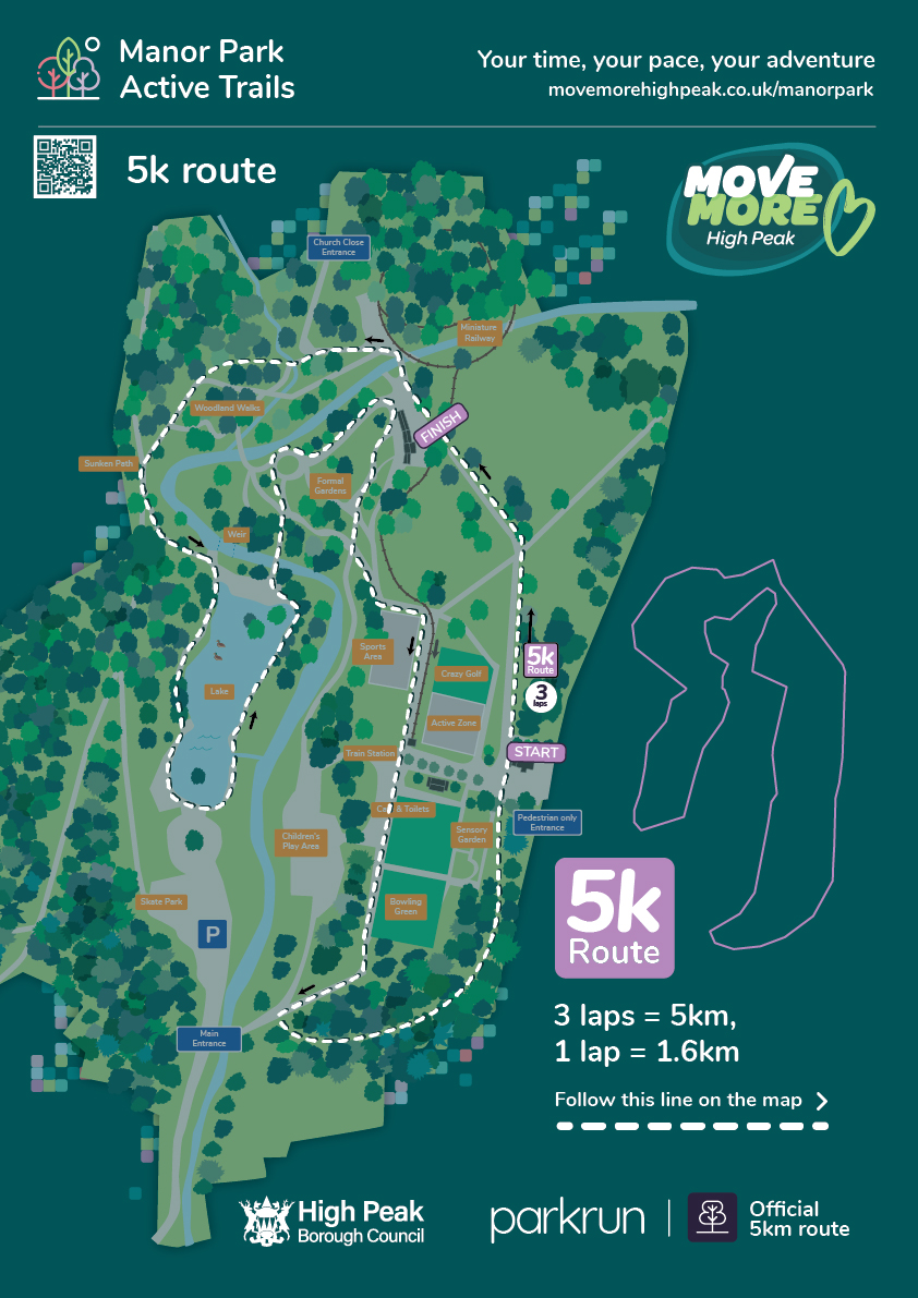 The 2k and 5k route are the official parkrun and junior parkrun routes at Manor Park, Glossop. These consist of three laps of the route for the 2k, and three laps of the 5k routes, to make up the distance of each, so you have the option of trying out one or two laps of these routes, either as a walk or jog whenever you choose, to familiarise yourself with the routes, or to use to begin to increase your fitness levels.